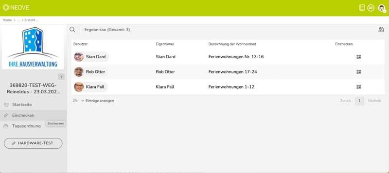 In den vergangenen Monaten haben wir das bereits gut gelöst durch die Möglichkeit der technischen Vertretung durch den Hausverwalter*in: Die Präsenzteilnehmer*innen können wie bisher an der WEG-Versammlung teilnehmen und ihre Stimme bei den Abstimmungen per Handzeichen abgeben. Der Verwalter*in dokumentiert anschließend die Stimmenabgabe innerhalb von NEOVE. So kann die Auswertung der Abstimmung über Online- und Präsenzteilnehmer*innen gleichermaßen erfolgen.
